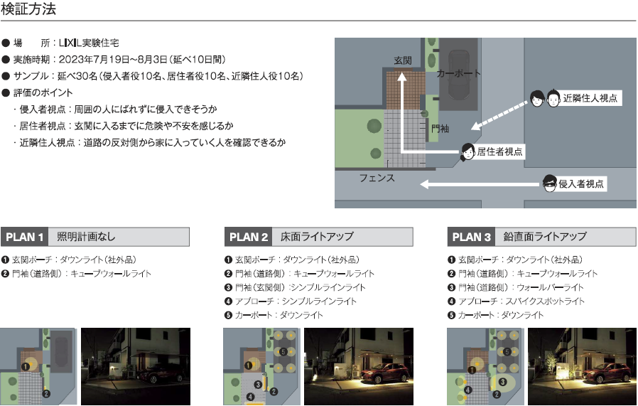 夜の住まいを明るくすると、防犯にどれくらい効果があるのか。実際の住宅でファサード部分の照明プランの違いによる防犯効果を検証しました。