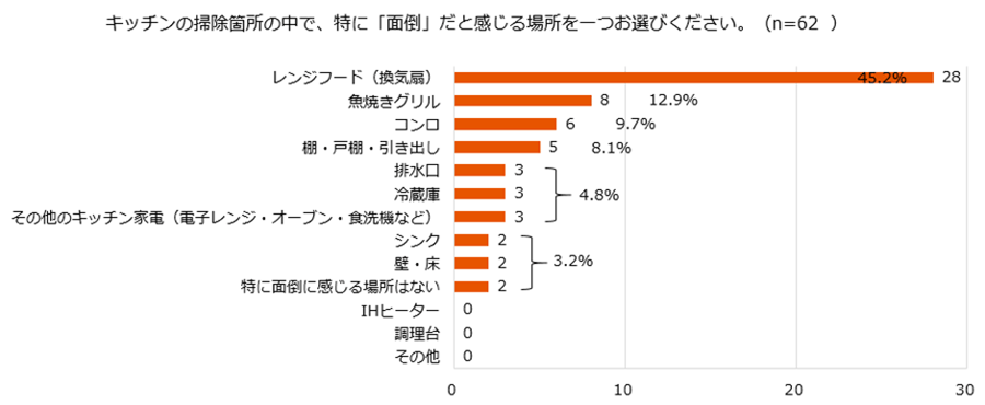 次に、特に面倒だと感じる場所を尋ねると、「レンジフード(換気扇)」が45.2%で断トツの1位に。掃除の必要性を感じながらも、誰もが手を焼いている“キッチンのラスボス”的存在であることが明らかになりました。