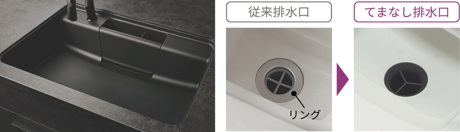LIXILキッチンのシンクは、排水口のフタやゴミカゴ、洗剤やスポンジなどを入れるワイヤーポケットなど、すべてのパーツを取り外して丸洗いすることができます。特に『てまなし排水口』は、他パーツ同様に丸洗いできるほか、接合部のリングをなくしたことで、汚れがたまりやすい溝もなくなり、お手入れが簡単なスッキリとしたデザインに仕上げています。