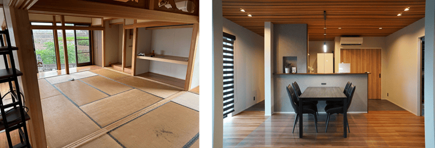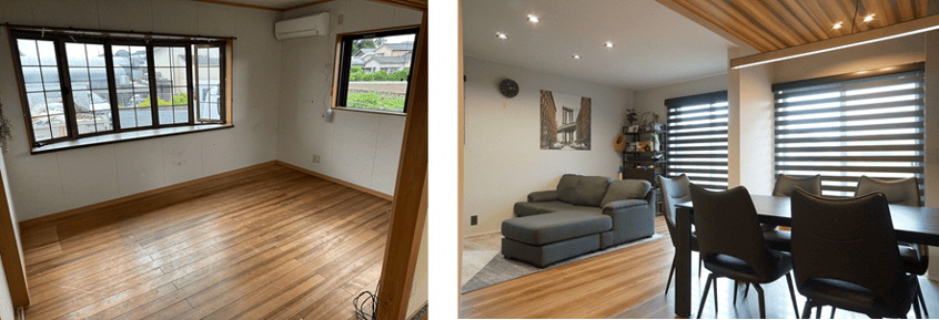出なくなりました。気密性の高さが虫を寄せつけないのだと思います」「また、平屋の暮らしは理想でしたが、リノベ前の間取りはキッチンとダイニングが廊下を挟んで別々で、とっても不便だったので増築も含めて今の暮らしに合うように間取りを一新。キッチンの場所も変えて、使い勝手の良い開放的なLDKを叶えることができました」
