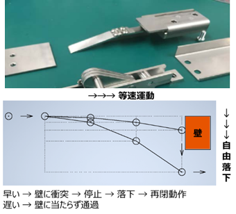 この法則に着眼し、窓を閉じる際の水平速度に応じて、自重により落下する動作部品が、窓枠側のストッパに衝突して停止するか、衝突を回避して作動を継続するかを正確に制御する機構を開発しました。