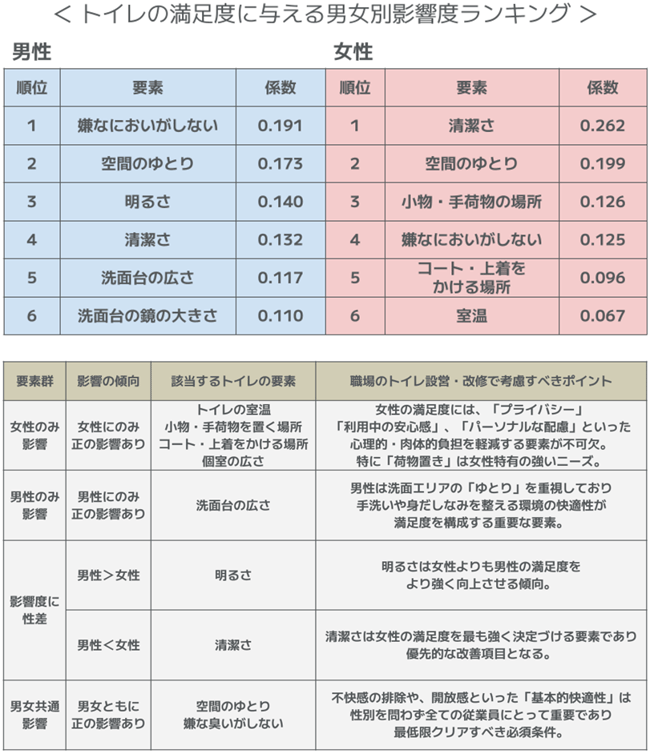 ・この「トイレの満足度 → 仕事の満足度」の影響度は、男女で統計的に差がなく、トイレに対する満足感が形成されれば、性別によらずその後の仕事への好影響を与えることがわかった。