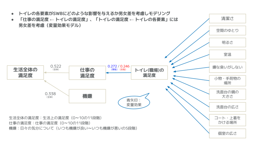 ・トイレの満足度が仕事の満足度に影響を与え、さらにその仕事の満足度が生活全体の満足度(SWB)に寄与することが判明した。