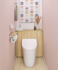 トイレ背面の左右に大容量の収納がついたキャビネット付便器。収納には、掃除用具もごみ箱も生理用品もしまうことが可能で、扉を閉じれば、すっきりとしたトイレ空間に。