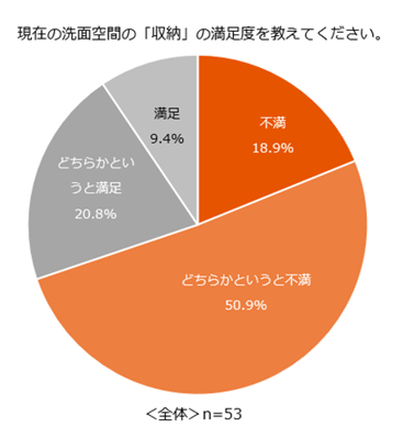 普段利用している洗面空間の「収納」に対する満足度を尋ねたところ、「不満」(18.9%)、「どちらかというと不満」(50.9%)を合わせ、実に69.8%もの方が不満を感じていることが判明。「満足」と回答した方はわずか9.4%に留まり、多くの家庭で洗面空間の収納が課題となっている現状が明らかになりました。