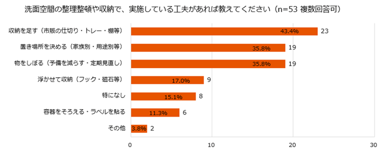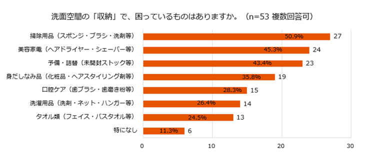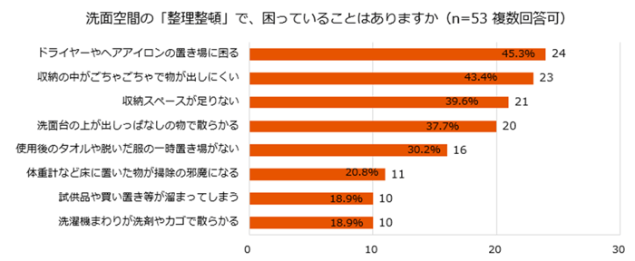 次に「収納の中がごちゃごちゃで物が出しにくい」(43.4%)、「収納スペースが足りない」(39.6%)、「洗面台の上が出しっぱなしの物で散らかる」(37.7%)と続きました。限られたスペースに物があふれ、結果的に使い勝手の悪さや見た目の乱雑さに繋がっている様子がわかります。