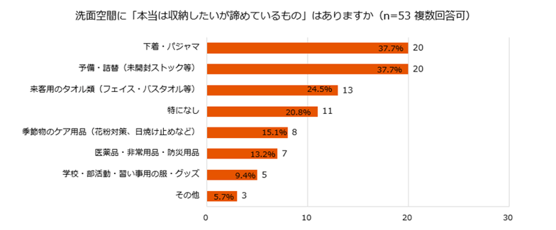 スペース不足などから「本当は収納したいけど諦めているもの」を調査したところ(複数回答)、非常に興味深い結果が出ました。最も多かったのは「下着・パジャマ」(37.7%)と「予備・詰替(未開封ストック等)」(37.7%)が同率1位。