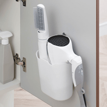 デッドスペースになりがちな扉裏のスペースを収納スペースに。置き場に困りがちなドライヤーなどがサッと取り出しやすい位置に収納できます。