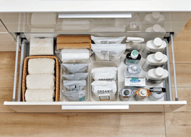 奥の物まで一目で見渡せ、出し入れしやすい引出収納です。背の高い洗剤ボトルや大容量の詰替えストックも、縦置きのままラクラク収納できます。