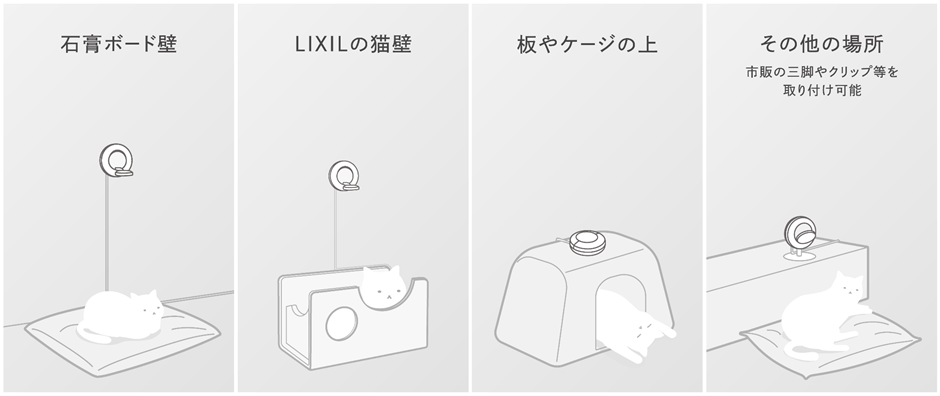 猫が毎日寝たりリラックスして過ごすお気に入りの場所(ペットベッド、ケージ、棚など)の上部に設置します。石膏ボード壁へのピン留めや、マグネットによる「猫壁」への取り付けもできます。また、工事不要なので賃貸住宅でも設置が可能です。