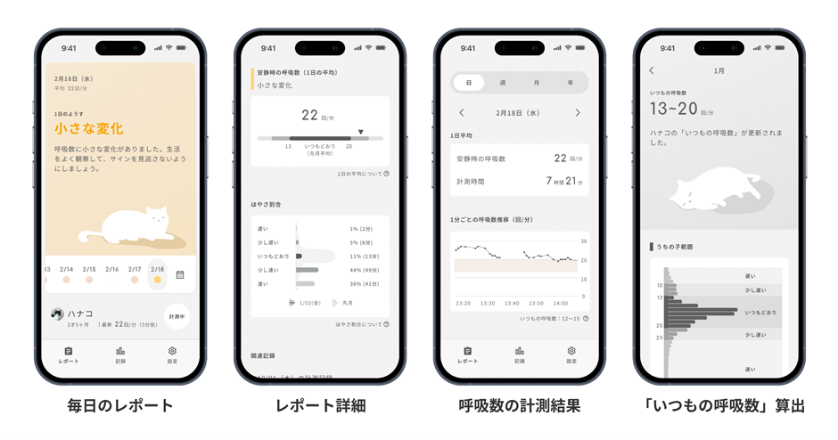 デバイスに搭載されたミリ波センサーにより、非接触で安静時の呼吸数を計測します。首輪やウェアラブルデバイスが苦手な猫でも、普段どおりの生活の中で自然に健康状態を把握できます。