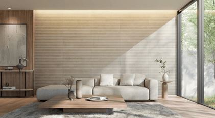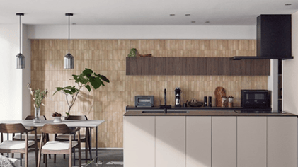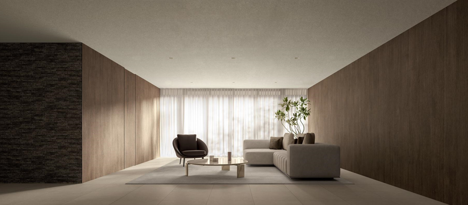 エコカラットプラスからは、「COMFORT GRAIN」の空間構成に欠かせない素材感を演出する新デザイン「コットアルテ」が登場。さまざまな建材と美しく調和し、リビング空間を洗練された印象に仕上げます。ハンドメイドの素焼きをイメージした、テラコッタやレンガが持つ温もりを表現したデザインです。焼き物らしい表情に加え、繊細なレリーフと3種の厚み差による穏やかな陰影が、ナチュラルで柔らかな空気感を醸し出します。