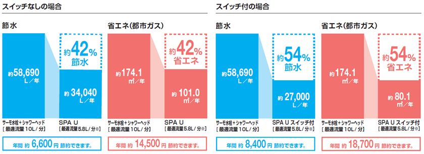 一般的なシャワーヘッドと比べた時に、止水スイッチなしのものでも約37%節水できます。止水スイッチ付はさらに節水することができ、節約に繋がります。