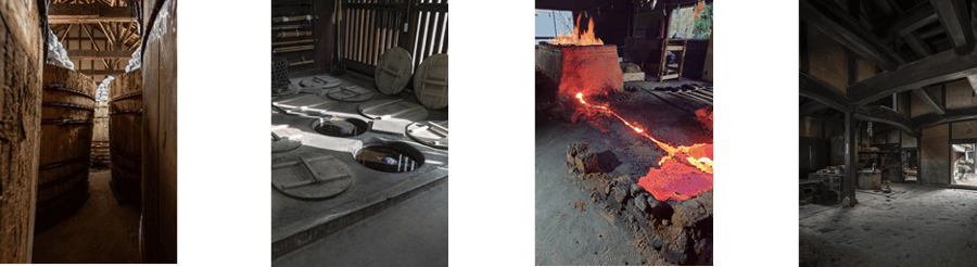 写真①まるや八丁味噌「味噌蔵」(主に温度保持、耐荷重性) ②郡上本染 渡辺染物店「甕場」(主に蓄熱性・耐水性) ③たなべたたらの里「たたら吹き」の作業場(主に耐火性・耐荷重性)/写真提供:たなべたたらの里 ④重要文化財 旧内田家住宅(南知多町)の「主屋にわ(土間)」(主に耐汚性・耐水性) 特記以外撮影:ToLoLo studio
