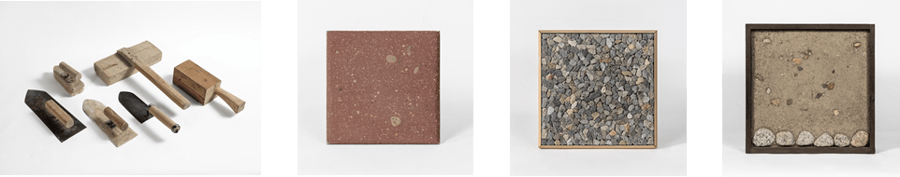 写真①三和土をつくる道具類(左から/金鏝、ブラシ、木鏝、たたき鏝、たたき棒※、木槌)所蔵:川口正樹、 久住有生(※)②土間床見本「かき落としスポンジ拭き取り」制作・所蔵:久住有生/300×302×H30mm ③土間床見本「あられこぼし」制作・所蔵:西川和也/425×425×H45mm ④土間床見本「土佐漆喰たたき」制作・所蔵:松木憲司/450×450×H100mm 撮影すべて:ToLoLo studio