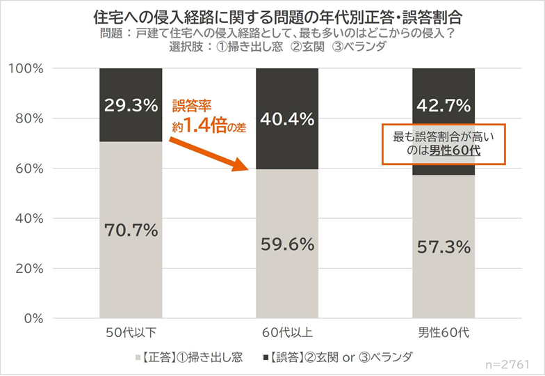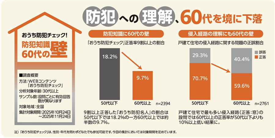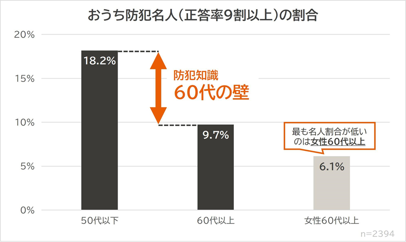 おうち防犯名人(正答率9割以上)の割合、60代以上はわずか9.7%と50代以下(18.2%)の約半分。特に「侵入経路」の理解にギャップ。