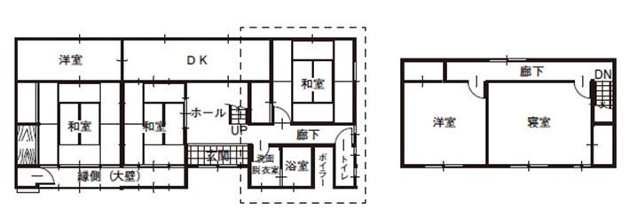 昔ながらの日本家屋らしい2階建住宅。1階右側の点線で囲んだスペースが50年ほど前にお父様が増築した部分。