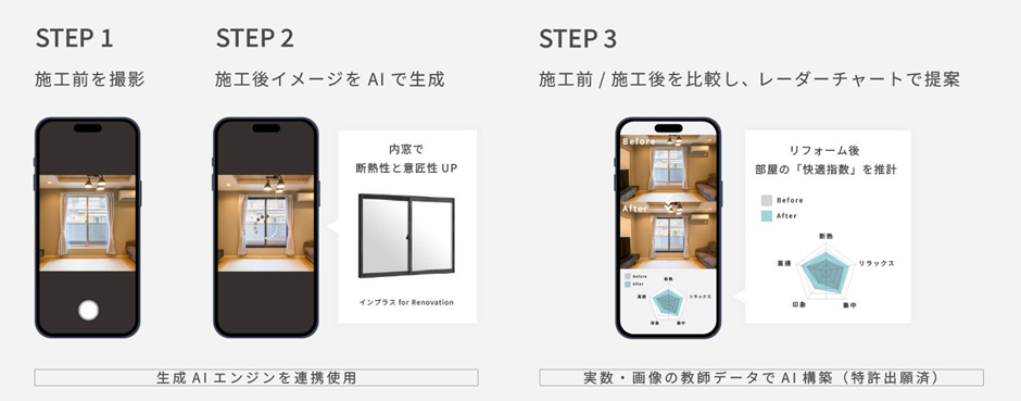 ユーザーがスマートフォンで既存の部屋を撮影するだけで、AIが改修後の部屋の画像を生成することに加え、AI解析モデルが断熱窓改修後のリラックス度や集中度などを予想し、レーダーチャートで変化を可視化します。改修前後の感情変化をシミュレーション比較し、「この窓に変えると、毎日がこれだけ心地よくなる」という、一人ひとりの感性に寄り添った納得感のある提案手法を確立します 。この解析は、サービス利用者の脳波を計測するのではなく、LIXILの体験型施設「住まいStudio(スタジオ)」にて、実際の断熱性能の変化に伴う反応を脳波計測した実験データを活用しています。